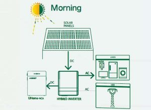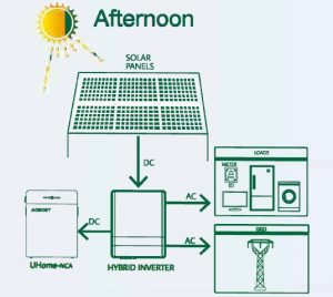 ![]() | సూర్యుడు అస్తమించినప్పుడు బ్యాటరీలు AC లోడ్కు శక్తినిస్తాయి. |