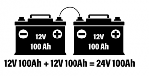 క్రింద ఉన్న చిత్రంలో, రెండు ఉన్నాయి 12 వి బ్యాటరీలు ఈ బ్యాటరీ బ్యాంక్ను 24 వి సిస్టమ్గా మార్చే సిరీస్లో కనెక్ట్ చేయబడింది. బ్యాంక్ ఇప్పటికీ 100 అహ్ సామర్థ్య రేటింగ్ కలిగి ఉందని మీరు చూడవచ్చు.